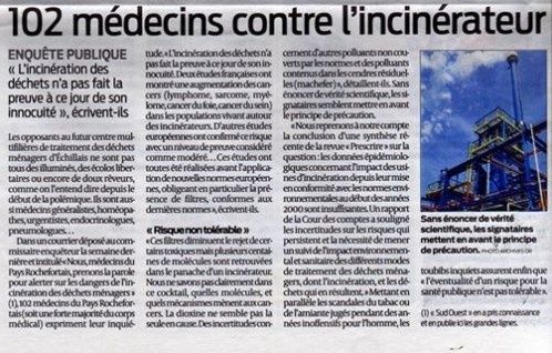 A Rochefort, 102 médecins se prononcent contre le nouvel incinérateur projeté sur Echillais et signent une lettre aux commissaires enquêteurs chargés de l'enquête publique.