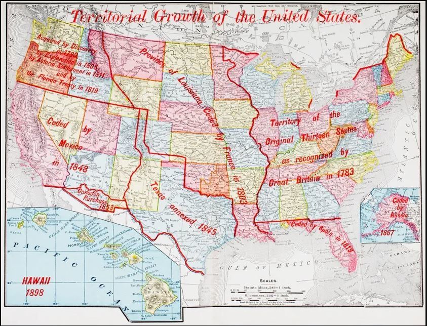 Les Etats-Unis de 1783, ce sont treize Etats ancrés sur la façade atlantique et coincés entre le Canada britannique, l'Atlantique et la Louisiane espagnole. En moins d’un siècle, le pays contrôle un territoire continu entre les deux océans : Atlantique et Pacifique. Une expansion rendue possible par la colonisation, la conquête, parfois brutale, ou l’achat de territoires.